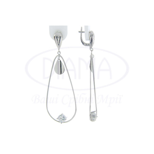 Сережки срібні у формі краплі з білим цирконом. Срібло 925 проби, покрите родієм. Розмір краплі 25х55 мм. Діаметр камня 6 мм.