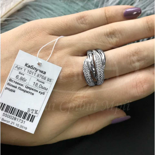 Срібна каблучка з білим цирконом. Срібло 925 проби, покрите родієм.
