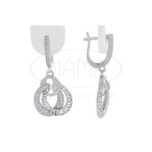 Сережки срібні з білим цирконом у формі 2 овалів і круга. Срібло 925 проби, покрите родієм. Розмір головного елементу сережки 16х17,5 мм. В комплекті каблучка, сережки та підвіска.