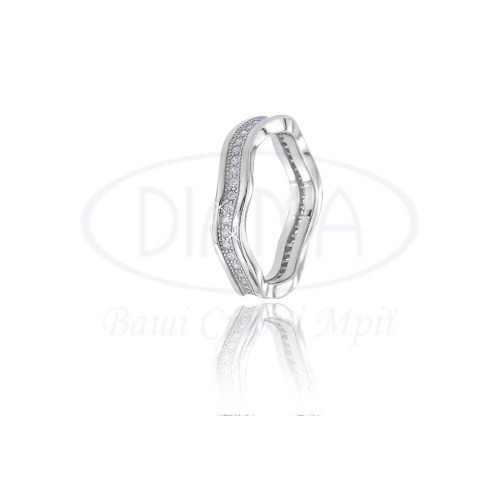Срібна каблучка з білим цирконом, що розташований по всьому колу у формі хвилі. Срібло 925 проби, покрите родієм. Ширина каблучки 4 мм.