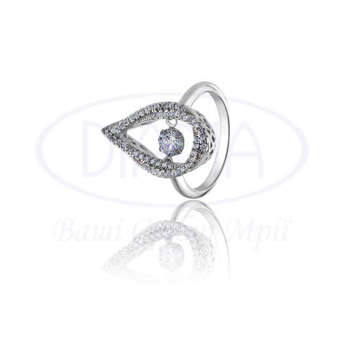 Срібна каблучка з білим цирконом у формі краплі та камінь який рухається. Срібло 925 проби, покрите родієм. Розмір головного елементу каблучки 20х12 мм. В наборі присутні каблучка, підвіска та сережки.