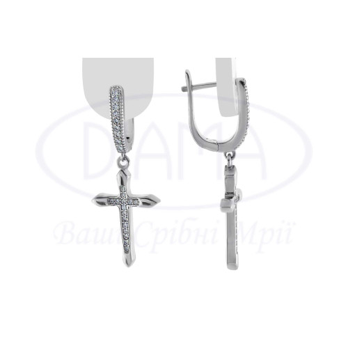 Сережки срібні у формі хрестика з білим цирконом. Срібло 925 проби, покрите родієм. Розмір хрестика 15х23 мм.