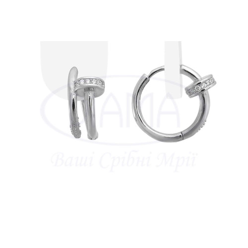 Срібні сережки в формі цвяха з білим цирконом. Срібло 925 проби, покрите родієм. В наборі присутні браслет, сережки, підвіска та каблучка.