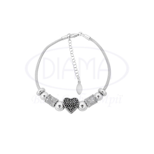 Срібний браслет в стилі Pandora з прикрасою у формі серця з чорною емаллю та білим Цирконом. Срібло 925 проби, покрите родієм. В браслеті можуть відрізнятися деякі другорядні елементи та їх колір.