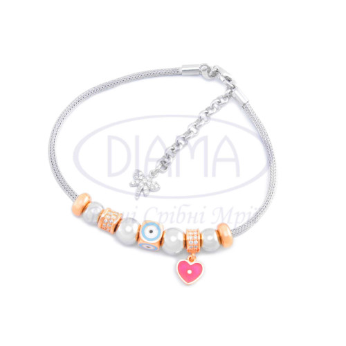 Браслет срібний з білим цирконом та емаллю блакитного та білого кольору. Срібло 925 проби, покрите родієм та червоною позолотою. Комбінація додаткових "шармів" може відрізнятися від фото.