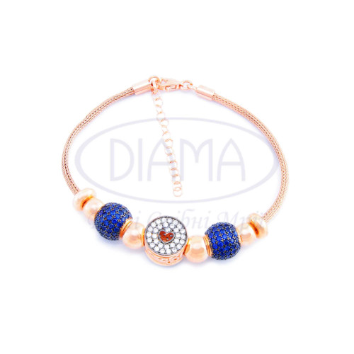 Браслет срібний з білим та синім цирконом. Срібло 925 проби, покрите червоною позолотою. Комбінація додаткових "шармів" може відрізнятися від фото.