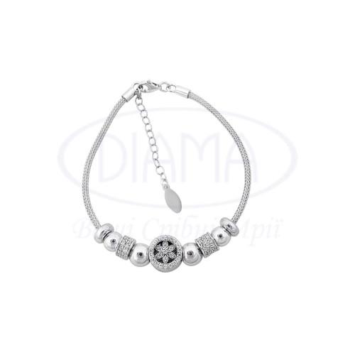 Срібний браслет в стилі Pandora з шармом у формі кола, в середині якого квітка з білим Цирконом. Срібло 925 проби, покрите родієм. В браслеті можуть відрізнятися деякі другорядні елементи та їх колір.