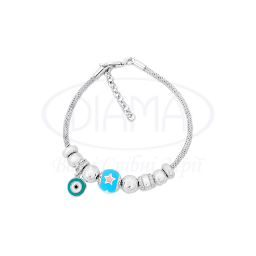 Браслет срібний з білим цирконом та емаллю блакитного та рожевого кольору. Срібло 925 проби, покрите родієм. Комбінація додаткових "шармів" може відрізнятися від фото.