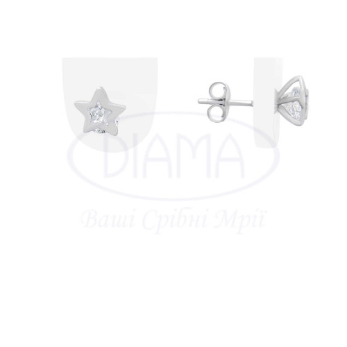 Пусети срібні у формі зірки з білим цирконом. Срібло 925 проби, покрите родієм. Розмір 7*7,5 мм.
