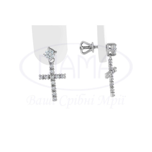 Сережки срібні з білим цирконом у формі круга та хрестика. Срібло 925 проби, покрите родієм. Розмір камня 4 мм, розмір хрестика 11х19 мм.