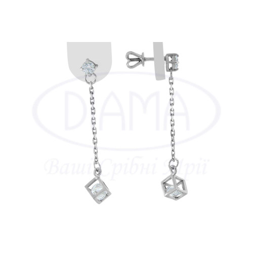 Сережки срібні з білим та чорним цирконом у формі двох кругів та куба. Срібло 925 проби, покриття родій. Діаметр верхнього круга 4 мм, розмір куба 6х6 мм.