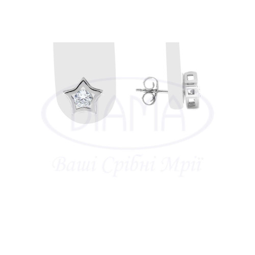Пусети срібні з білим цирконом у формі зірки, розміром 9х8 мм. Срібло 925 проби, покрите родієм.
