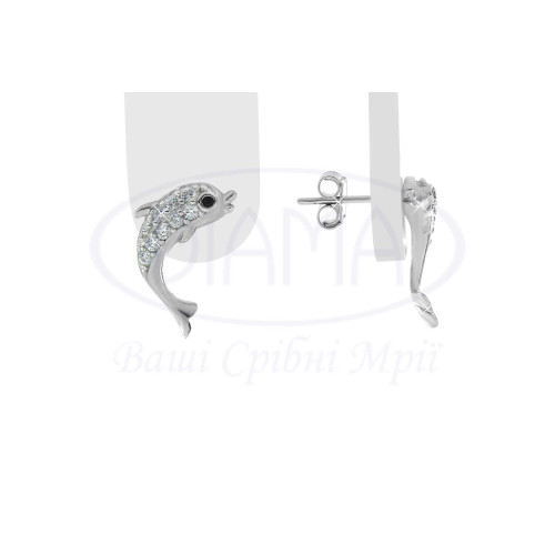 Пусети срібні з білим та чорним цирконом у формі дельфіна, розміром 10х16 мм. Срібло 925 проби, покрите родієм.