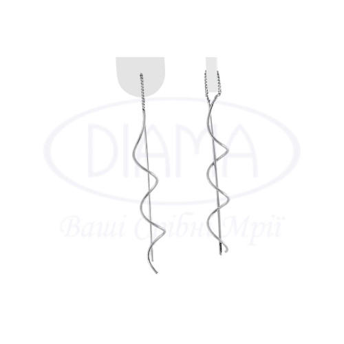 Сережки срібні у формі палички та хвилі які з'єднані між собою ланцюгом. Срібло 925 проби, покрите родієм. Висота сережки 52 мм.