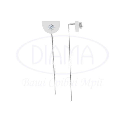 Сережки срібні у формі палички та квадрата з білим цирконом які з'єднані між собою ланцюгом. Срібло 925 проби, покрите родієм. Висота палички 19 мм, а діаметр квадрата 5 мм.