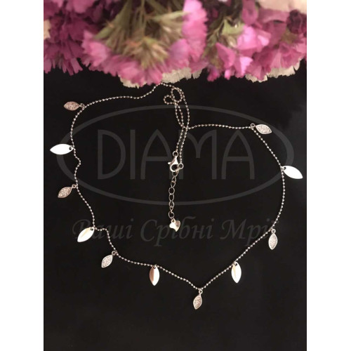 Кольє срібне з прикрасами у формі листочків з білим цирконом. Срібло 925 проби, покрите родієм.
