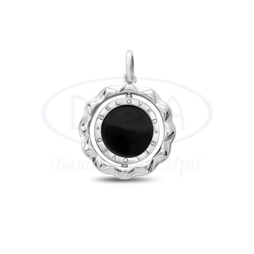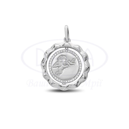Срібна підвіска двостороння, перша сторона з білим цирконом та зображенням янгола і голуба, а друга сторона чорна емаль, у формі круга. Срібло 925 проби, покрите родієм. Діаметр великого круга 25 мм.,а малого круга 17 мм.