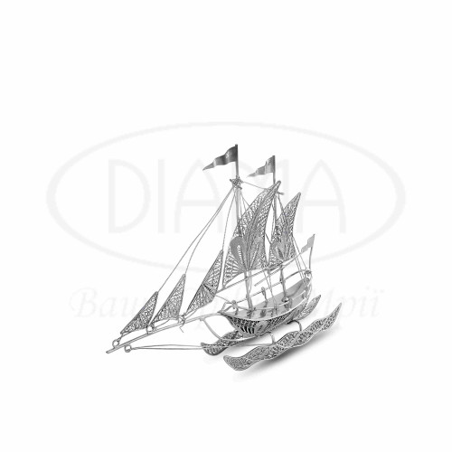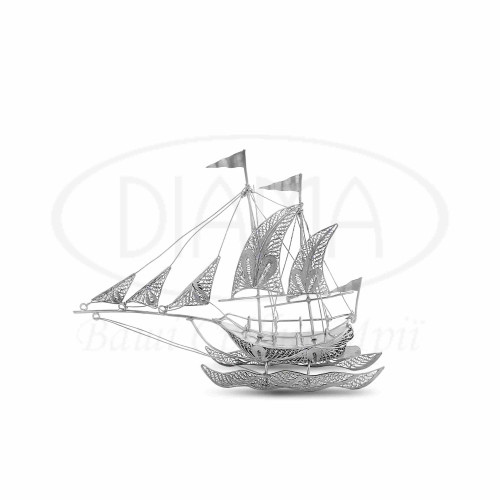 Статуетка срібна у формі корабля з відкритими вітрилами які рухаються, також на вітрилах зображенні візерунки які попередньо виконані у стилі філігрань. Срібло 925 проби, покрите родієм. Висота корабля 100 мм, довжина 125 мм, ширина 25 мм.