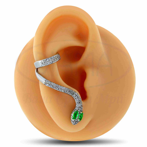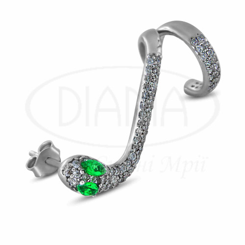 Сережка срібна Каффа у формі змії з білим та зеленим цирконом. Срібло 925 проби, покрите родієм. Діаметр каффи 15 мм, висота 32 мм.