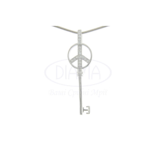 Підвіска срібна у формі ключа прикрашена білим цирконом, на підвісці також присутній Знак Миру. Срібло 925 проби, покрите родієм.