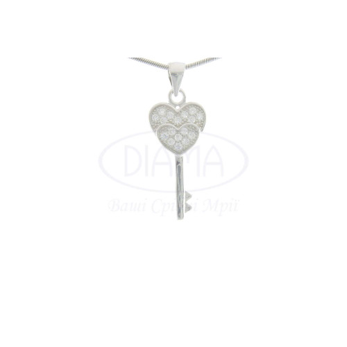 Підвіска срібна у формі ключа та подвійного сердечка з білим цирконом. Срібло 925 проби, покрите родієм.