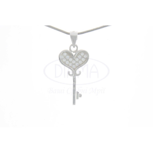 Підвіска срібна у формі ключа прикрашена білим цирконом, також на підвісці можна побачити елемент у формі серця, що робить її ще ніжнішою. Срібло 925 проби, покрите родієм.