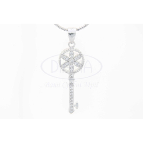 Підвіска срібна у формі ключа з квіткою, прикрашена білим цирконом. Срібло 925 проби, покрите родієм.