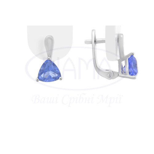 Срібні сережки з Танзанітом в формі трикутника. Срібло 925 проби, покрите родієм. В наборі присутні каблучка, сережки та підвіска. Розмір головного елементу 8*8 мм.