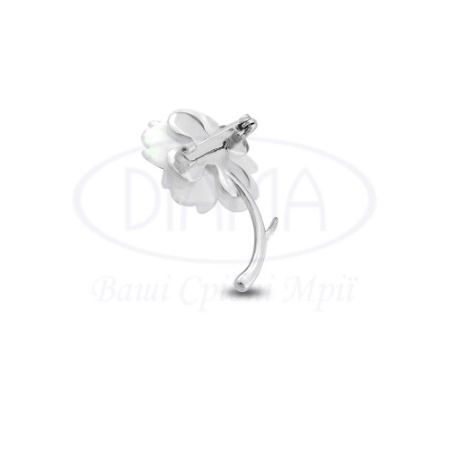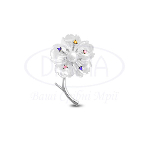 Брошка срібна з білим перламутром у формі квітки, різнокольоровим цирконом та перлиною. Срібло 925 проби, покрите родієм.