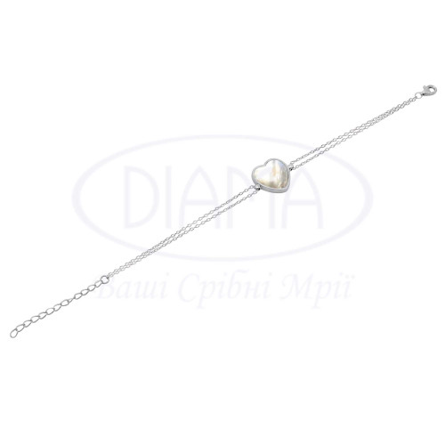Срібний браслет з білим перламутром в формі серца. Срібло 925 проби, покрите родієм. Розмір головного елементу 17 мм.