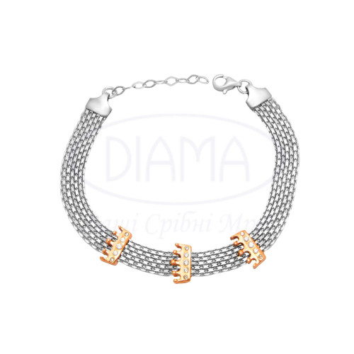 Браслет срібний в стилі Пандора (Pandora) з прикрасою у формі корони з білим цирконом. Срібло 925 проби, покрите родієм та червоною позолотою.