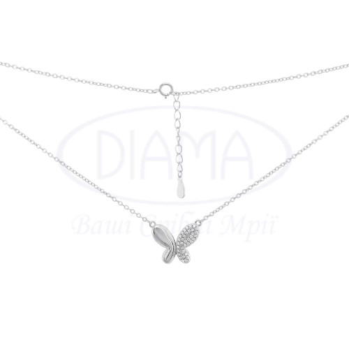 Кольє срібне в формі метелика з білим цирконом. Срібло 925 проби, покрите родієм. Розмір метелика 19х15 мм.