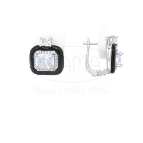 Срібні сережки з білим цирконом та чорною емаллю. Срібло 925 проби, покрите родієм. В наборі присутні каблучка, сережки та підвіска.