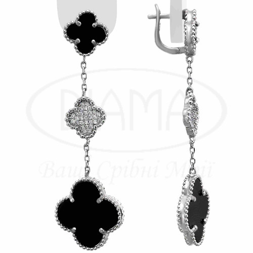 Сережки потрійні срібні з Оніксом та білим цирконом. Срібло 925 проби, покрите родієм. Сережки виготовлені в формі "Клевер".
