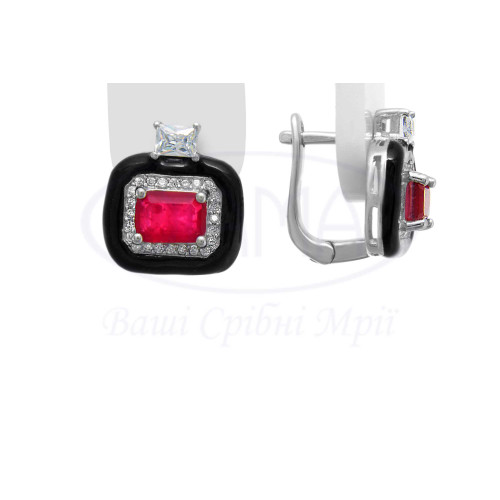 Срібні сережки з червоним та білим цирконом, а також чорною емаллю. Срібло 925 проби, покрите родієм. В наборі присутні каблучка, сережки та підвіска.