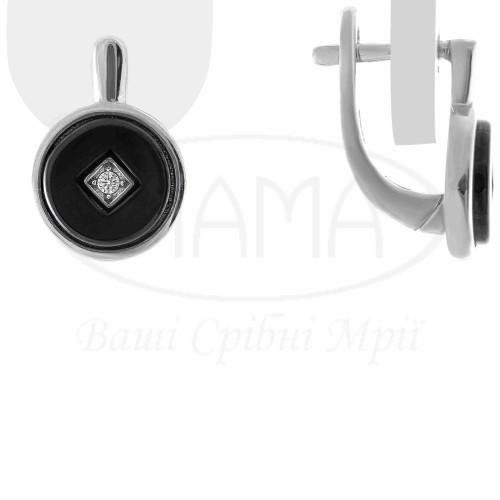 Сережки срібні з чорною керамікою у формі кола та білим цирконом. Срібло 925 проби, покрите родієм. В наборі сережки та підвіска.