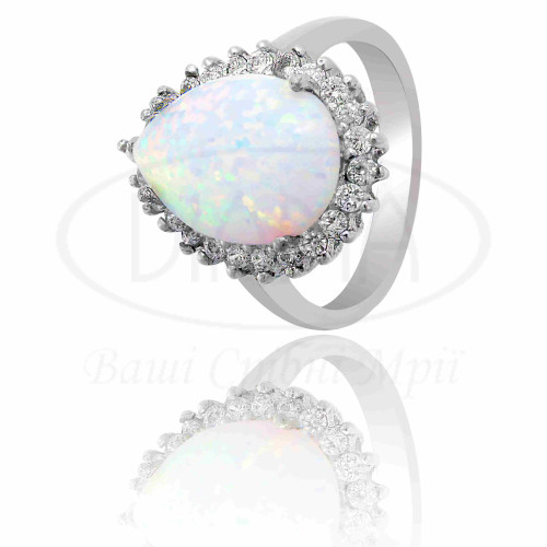 Каблучка срібна в формі краплі з білим опалом та цирконом. Срібло 925 проби, покрите родієм. В наборі присутні Каблучка та сережки.