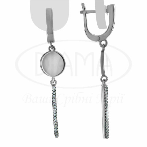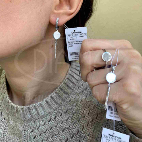 Сережки срібні з білим цирконом у формі круга та палички. Срібло 925 проби, покрите родієм. Розмір головного елементу сережки (Круг) 10 мм, (паличка) 23 мм. В комплекті каблучка, сережки та підвіска.