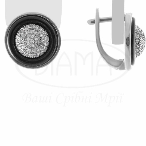 Сережки срібні з чорною керамікою та білим цирконом у формі кола. Срібло 925 проби, покрите родієм. В наборі каблучка, сережки та підвіска.