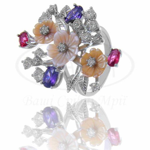 Каблучка срібна в стилі Роберто Браво у формі квітів. Срібло 925 проби, покрите родієм. Вставка: перламутр, циркон фіолетовий, емаль. Комплект складається з каблучки та сережок.