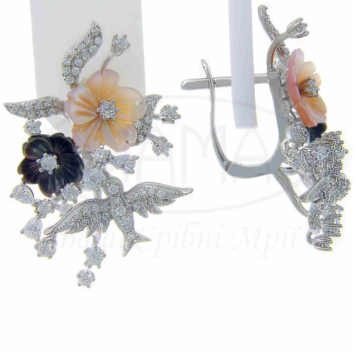 Сережки срібні в стилі Роберто Браво у формі квітів. Срібло 925 проби, покрите родієм. Вставка: перламутр, мікс циркону. Комплект складається з каблучки, підвіски та сережок.