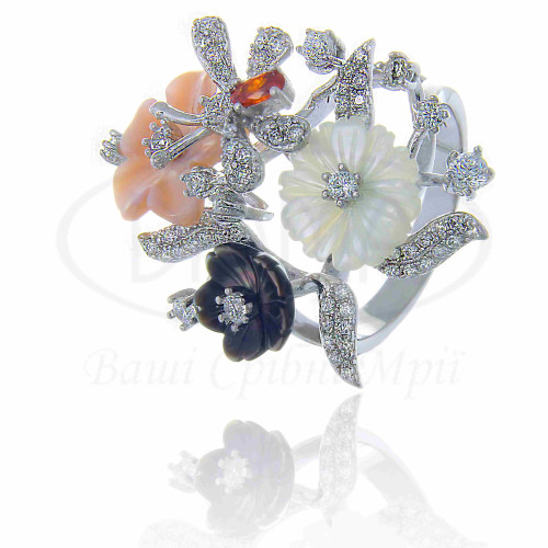 Срібна каблучка з цирконом та перламутром, виконана в стилі Роберто Браво. Срібло 925 проби, покрите родієм. Складається комплект з каблучки, підвіски та сережок.