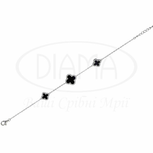 Браслет срібний з оніксом та білим цирконом. Срібло 925 проби, покрите родієм. Браслет виготовлений в формі "Клевер". В наборі присутні каблучка, кольє, сережки, підвіс та браслет. Розмір головних елементів - 14 мм та 10 мм.