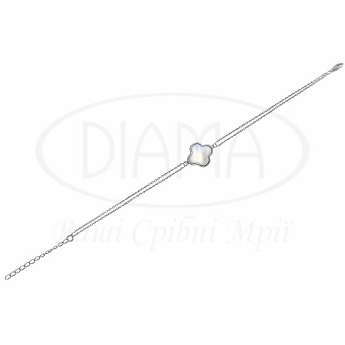 Срібний браслет 925 проби, покритий родієм. Вставка білий Перламутр. Виготовлений в формі Конюшини. Розмір головного елементу 16 мм.