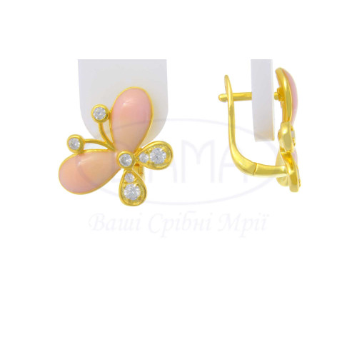 Срібні сережки з кольоровою емаллю та білим цирконом. Срібло 925 проби, покрите жовтою позолотою. До комплекту входить каблучка, підвіска та сережки.
