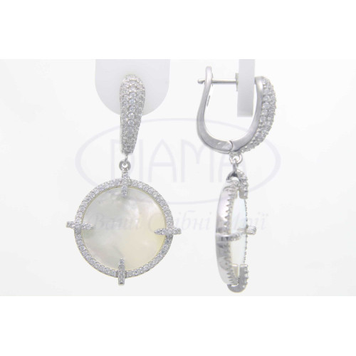 Срібні сережки з білим перламутром та білим цирконом. Срібло 925 проби, покрите родієм. Комплект складається з каблучки, підвіски та сережок.