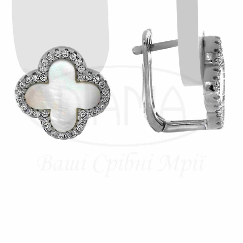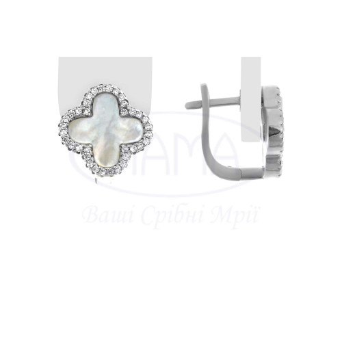 Сережки срібні з білим перламутром та білим цирконом. Срібло 925 проби, покрите родієм. Сережки виготовлені в формі "Клевер". В наборі присутні каблучка, сережки та підвіс. Розмір головного елементу - 14 мм.