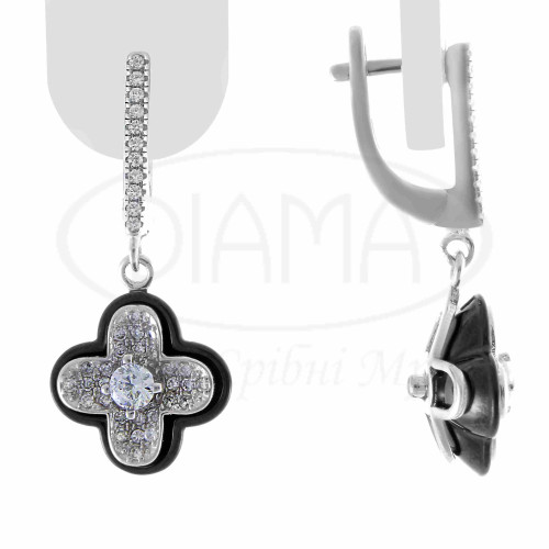 Сережки срібні з чорною керамікою та цирконом у формі "Клевер". Срібло 925 проби, покрите родієм. В наборі присутні каблучка, сережки та підвіска.