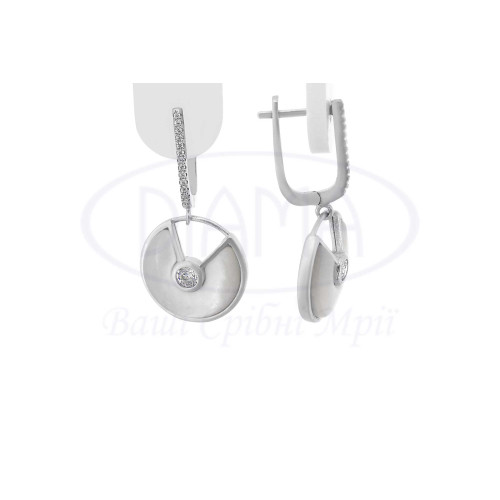 Срібні сережки з білим перламутром та білим цирконом у формі круга. Срібло 925 проби, покрите родієм. Комплект складається з каблучки, сережок, кольє та браслета. Діаметр круга 16 мм.