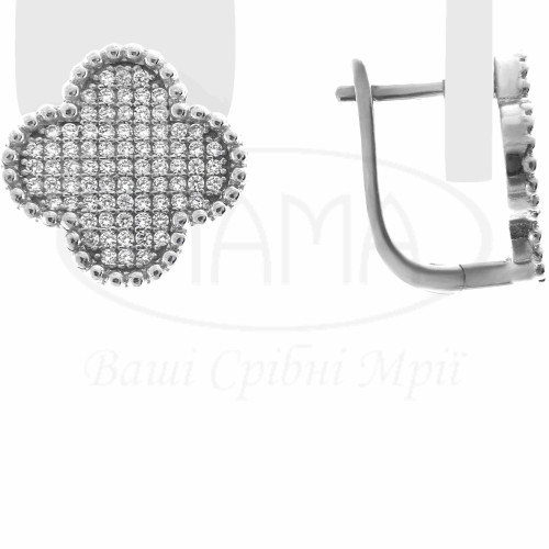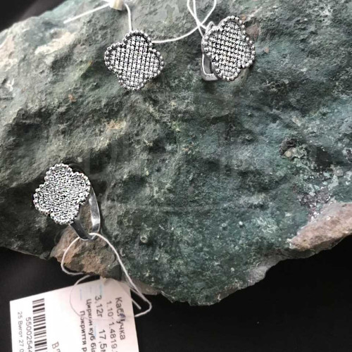 Сережки срібні з Цирконом, виконані у формі "Клевер". Срібло 925 проби, покрите родієм. Комплект складається з каблучки, підвіски та сережок. Розмір клевера 14,5 мм